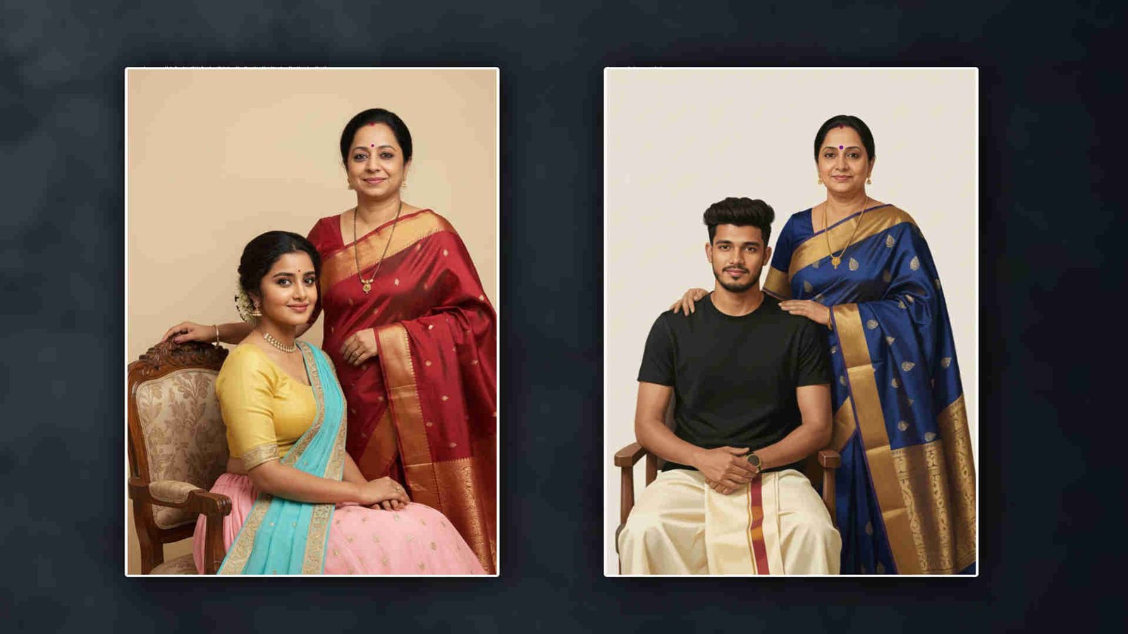 I am giving two photos one of me and one of my mother. Please generate a realistic portrait of us together in a studio-like setting. Make my mother stand beside me wearing a traditional saree with elegant patterns, simple jewelry, and a calm expression. Position me siting on a chair in front of her,